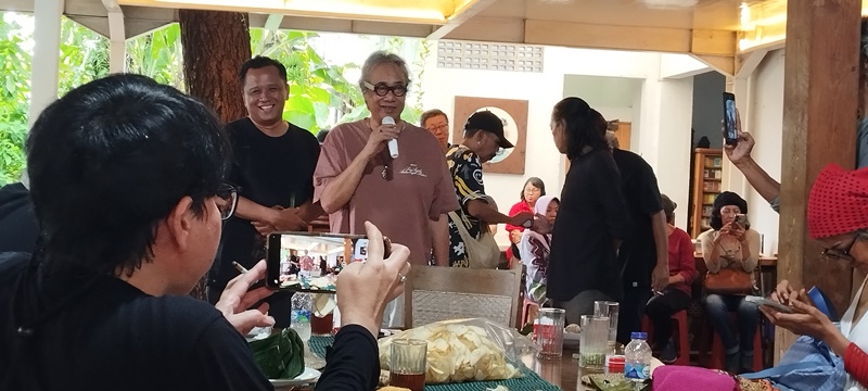 Sejak itu Butet hapal nama dan wajah saya. Bersama Priyo Jatmiko, teman yang saya kenal sejak masih di Harian Memorandum, saya datang ke acara peringatan ulang tahunnya ke-64 (21/11/25). Ini adalah ulang tahun Tumbuk Ageng versi tahun Masehi. Artinya, tepat 8 windu, alias 8 kali 8. Dua tahun lalu Tumbuk Ageng dirayakan menurut hitungan tahun Jawa. Dengan cara ini dia menganggap sebagai sebuah cara untuk menghormati para leluhur. Biasanya hanya peringatan ulang tahun sederhana oleh kalangan keluarga.